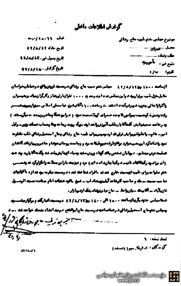 موضوع: مجلس ختم طيب حاج رضايى از ساعت 00:15 روز 12 / 8 / 42 مجلس ختم طيب حاج رضايى در مسجد فروتن واقع در خيابان خراسان مقابل منزل طيب برقرار بود در اين مجلس عدهاى در حدود 1000 نفر از بارفروشان و كارگران ميادين تهران و اكثر از اهالى جنوب شهر شركت داشتند. در ساعت 00:16 آقاى شيخ عباسعلى اسلامى سبزوارى روى منبر رفت و ضمن ذكر مصيبت پيرامون فاجعه صحراى كربلا صحبت نمود (در اين هنگام حاضرين به شدت مىگريستند) و در خاتمه صحبتهايش گفت آقايان طلب آمرزش را خداوند بزرگ روى درجات و مقام حساب نمىكند وزير، وكيل، امير، عالم، واعظ و فقير برايش فرقى ندارد و سپس براى طيب حاج رضايى و حاج اسمعيل رضايى طلب مغفرت نمود و اضافه كرد اين مصيبت وارده را از طرف عموم طبقات مردم و جامعه روحانيت و تمام حاضرين به بازماندگانشان تسليت عرض مىنمايم. در پايان شخصى با قد كوتاه و ريش سفيد و سياه از جايش بلند شد و گفت آقايان دم بدهيد (اى برادر در كجا افتادهاى - در كجا جان دادهاى) مردم نيز چند بار اين جملات را تكرار كردند و ضمن ختم صلوات براى طيب از مسجد خارج شدند. افراد شناخته شده در مسجد عبارت بودند از: باقر فروتن صاحب مسجد، مقدم صاحب كارخانه آبليموى شاداب، شيخ باقر دشتيانه امام جماعت مسجدالرسول نازى آباد، آقاى مقدسيان واعظ و حاج عباس نوشاد بنكدار در بازار. ضمنا مجلس ختم ديگرى از ساعت 00:15 الى 00:19 روز 13 / 8 / 42 در مسجد انبار گندم برگزار مىشود و مجلس ختم حاج اسمعيل رضايى در همان ساعت در مسجد حاج ابوالفتح در ميدان شاه منعقد خواهد شد. ضميمه پرونده طيب حاج رضايى و بايگانى شود. تعداد نسخه: 6 گيرندگان: اداره كل سوم (2 نسخه) |