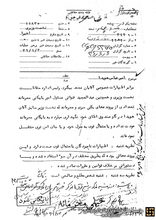 موضوع : اميرعباس هويدا به : 342 تاریخ 6 / 6 / 53 از : 20 ه 22 شماره : 63175 / 20 ه 22 برابر اظهارات خصوصى آقايان محمد بيگلرى رئيس اداره حفاظت نخستوزيرى و همچنين عبدالمجيد قنواتى مسئول امور بايگانى محرمانه تعدادى از پروندههاى بكلى سرى و محرمانه كه نخستوزير سابق آقاى هويدا در گاوصندوق اطاق خود نگهدارى مىكرده به بايگانى محرمانه عودت نداده و به احتمال قوى به منزل خود و يا جاى امنترى منتقل نمودهاند. نظريه شنبه : اظهارات نامبردگان به احتمال قوى صحت دارد و اين پروندههايى بوده كه به طريق مختلف در آن سوءاستفاده شده و يا دستوراتى برخلاف قوانين و مقررات صادر شده. نظريه سه شنبه : شنبه شخص مطلع و صالحى است. تاكستانى نظريه 4 شنبه : در زمينه مذكور منبع فوقالذكر خبر ديگرى را ارائه كه گزارش شده است. ماجد محترما از نظر استحضار به عرض مىرسد 28 / 6 / 36 روى 62423 بايگانى شود... |