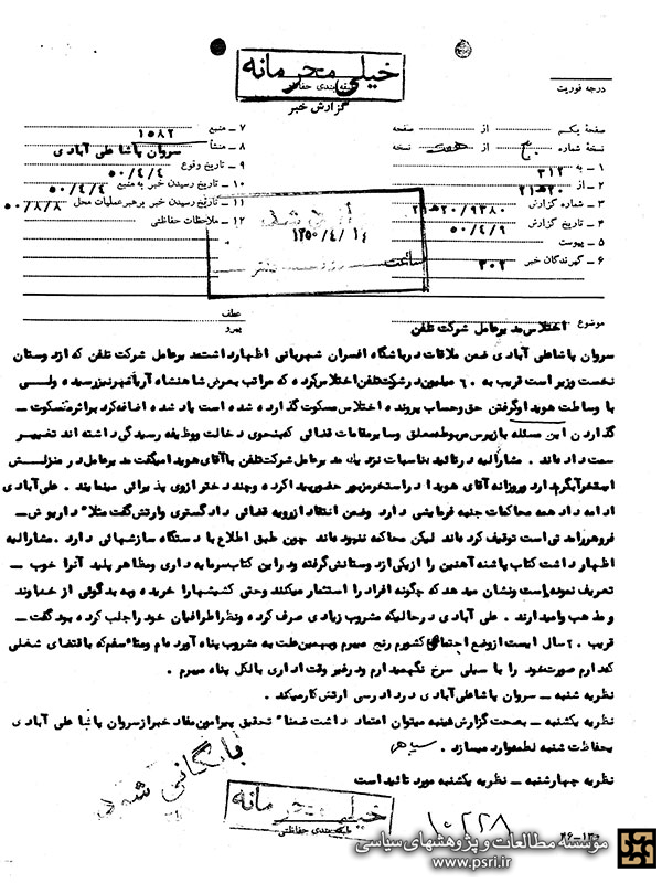 موضوع : اختلاس مديرعامل شركت تلفن به : 312 تاریخ 9 / 4 / 50 از : 20 ه 21 شماره : 9380 / 20 ه 21 سروان پاشا علىآبادى ضمن ملاقات در باشگاه افسران شهربانى اظهار داشت مديرعامل شركت تلفن كه از دوستان نخستوزير است قريب به 60 ميليون در شركت تلفن اختلاس كرده كه مراتب به عرض شاهنشاه آريامهر نيز رسيده ولى با وساطت هويدا و گرفتن حق و حساب پرونده اختلاس مسكوت گذارده شده است يادشده اضافه كرد بر اثر مسكوت گذاردن اين مسئله بازپرس مربوطه معلق و ساير مقامات قضائى كه به نحوى دخالت و وظيفه رسيدگى داشتهاند تغيير سمت دادهاند. مشاراليه در تائيد مناسبات نزديك مديرعامل شركت تلفن با آقاى هويدا مىگفت مديرعامل در منزلش استخر آبگرم دارد و روزانه آقاى هويدا در استخر مزبور حضور پيدا كرده و چند دختر از وى پذيرايى مىنمايند. علىآبادى ادامه داد همه محاكمات جنبه فرمايشى دارد و ضمن انتقاد از رويه قضائى دادگسترى و ارتش گفت مثلاً داريوش فروهر1 را مدتى است توقيف كردهاند ليكن محاكمه ننمودهاند چون طبق اطلاع با دستگاه سازشهايى دارد. مشاراليه اظهار داشت كتاب پاشنه آهنين را از يكى از دوستانش گرفته و در اين كتاب سرمايهدارى و مظاهر پليد آن را خوب تعريف نموده است و نشان مىدهد كه چگونه افراد را استثمار مىكنند و حتى كشيشها را خريده و به بدگويى از خداوند و مذهب وامىدارند. علىآبادى در حالى كه مشروب زيادى صرف كرده و نظر اطرافيان خود را جلب كرده بود گفت قريب 20 سال است از وضع اجتماعى كشورم رنج مىبرم و به همين علت به مشروب پناه آوردهام و متأسفم كه به اقتضاى شغلى كه دارم صورت خود را با سيلى سرخ نگه مىدارم و در غير وقت ادارى به الكل پناه مىبرم. نظريه شنبه : سروان پاشا علىآبادى در دادرسى ارتش كار مىكند. نظريه يكشنبه : به صحت گزارش شنبه مىتوان اعتماد داشت ضمنا تحقيق پيرامون مفاد خبر از سروان پاشا علىآبادى به حفاظت شنبه لطمه وارد مىسازد. سپاهى نظريه چهارشنبه : نظريه يكشنبه مورد تاييد است. 1ـ داريوش فروهر در سال 1307 در اصفهان بدنيا آمد. مبارزات سياسىاش را از سال 1322 در دبيرستان آغاز كرد و در سال 1327 هنگام تحصيل در دانشكده حقوق به «مكتب كه هسته بنيادى يك گروه سياسى بود»، پيوست و در سال 1328 به هنگام بنيانگذارى جبهه ملى ايران، همراه با دانشجويان ديگر، به يارى دكتر مصدق شتافت و در دوره 16 مجلس شوراى ملى در موفقيت دكتر مصدق به او كمكهاى شايانى كرد. در سال 1329 براى نخستين بار زندانى شد و در زمان حكومت رزمآرا بخاطر مبارزات ملى شدن صنعت نفت در دانشگاه، بار ديگر زندانى شد. در سال 1330 «مكتب» به «حزب ملت ايران» تبديل شد و فروهر در ديماه همان سال به دبيرى اين حزب انتخاب شد. وى در 29 خرداد 1331، سالروز خلع يد استعمارگران، براى سومين بار بازداشت شد و در 30 تير همان سال، مبارزات يارانش را در ميدان بهارستان رهبرى كرد. پس از 28 مرداد 1332 فروهر به مبارزات پنهانى ادامه داد و مردم را به مقاومت عليه كودتاچيان دعوت كرد و سرانجام در دى ماه همان سال دستگير شد و به جزيره قشم تبعيد گشت. در 30 تير 1339 در حالى كه در زندان به سر مىبرد، به عضويت شوراى مركزى جبهه ملى دوم برگزيده شد. فروهر از اندك شمار رهبران جبهه ملى بود كه از دوران زندان قيام 15 خرداد را نقطه عطف و دگرگونساز در پيكارهاى ملت ايران اعلام كرد. وى در سال 1343 بار ديگر به همراه گروهى از يارانش به زندان افتاد و به 3 سال زندان محكوم گشت. وى در سال 45 از زندان آزاد شد و در سال 49 نيز بدون محاكمه به 3 سال زندان محكوم گشت. در سال 56 به كوشش او و يارانش، «اتحاديه نيروهاى جبهه ملى» تشكيل شد. در سال 57 (26 دى ماه 57) همراه با دكتر سنجابى كه از ديدار با امام باز گشته بود، براى (26) بيست و ششمين بار زندانى شد و پس از آزادى به پاريس رفت و پس از 18 روز همراه امام به ايران باز گشت. و در دولت موقت به سمت وزير كار انتخاب شد. وى در سال 58 نماينده منتخب حزب ملت ايران براى رياست جمهورى ايران شد. سرانجام داريوش فروهر در تاريخ 30 آبان 1377 در منزل مسكونى خود در تهران به همراه همسرش به قتل رسيد. |